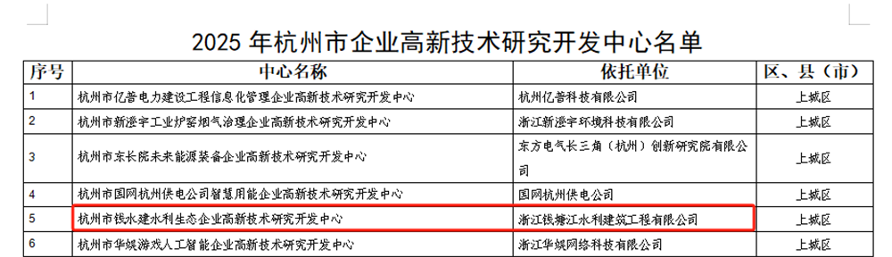 喜訊!浙錢水建入選杭州市企業高新技術研究開發中心