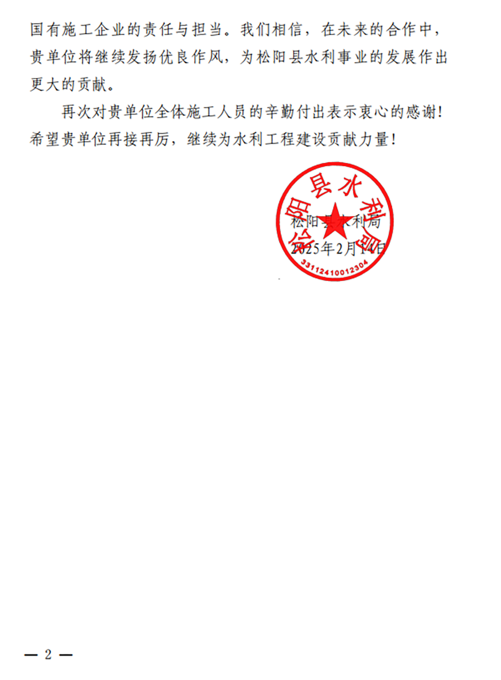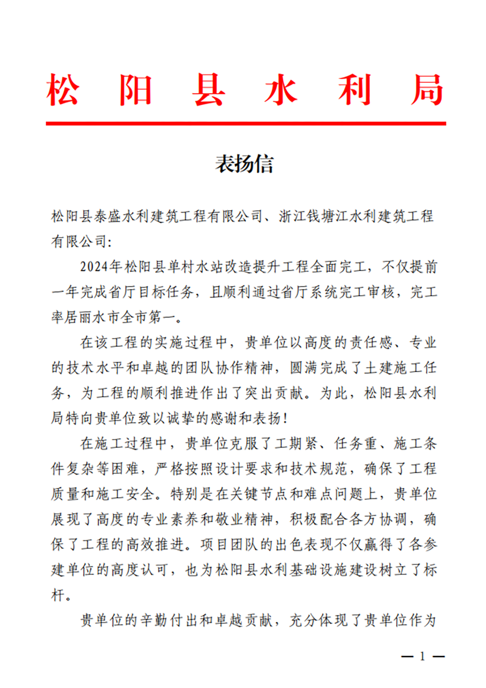 近日,一封來自松陽縣水利局的表揚信為“浙錢水建品牌”再添美譽。由浙錢水建承建的松陽縣單村水站改造提升工程得到了松陽縣水利局的高度贊揚和肯定。信中指出,浙錢水建施工項目團隊的出色表現(xiàn)不僅贏得了各參建單位的高度認可,也為松陽縣水利基礎(chǔ)設施建設樹立了標桿。