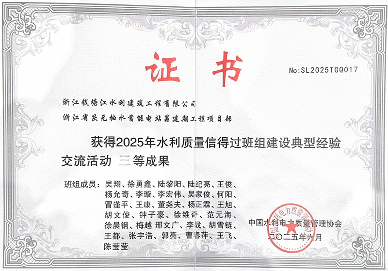 浙錢水建慶元抽蓄項目部榮獲全國水利質量信得過班組獎項